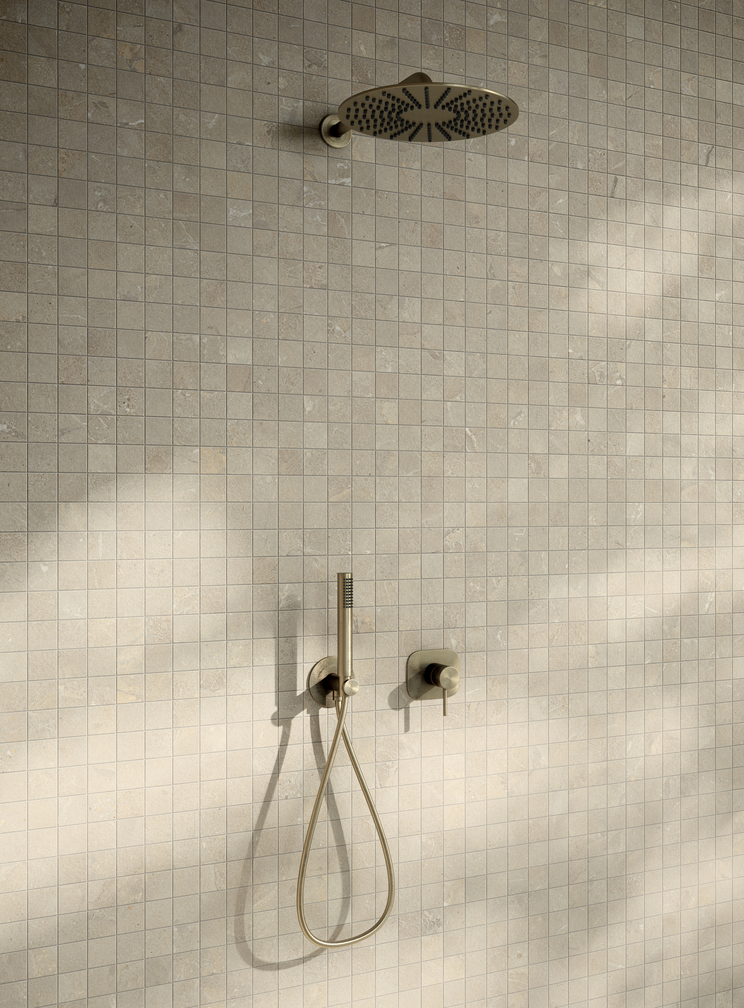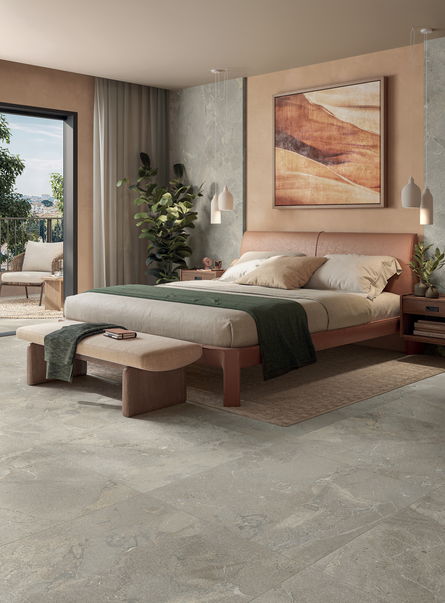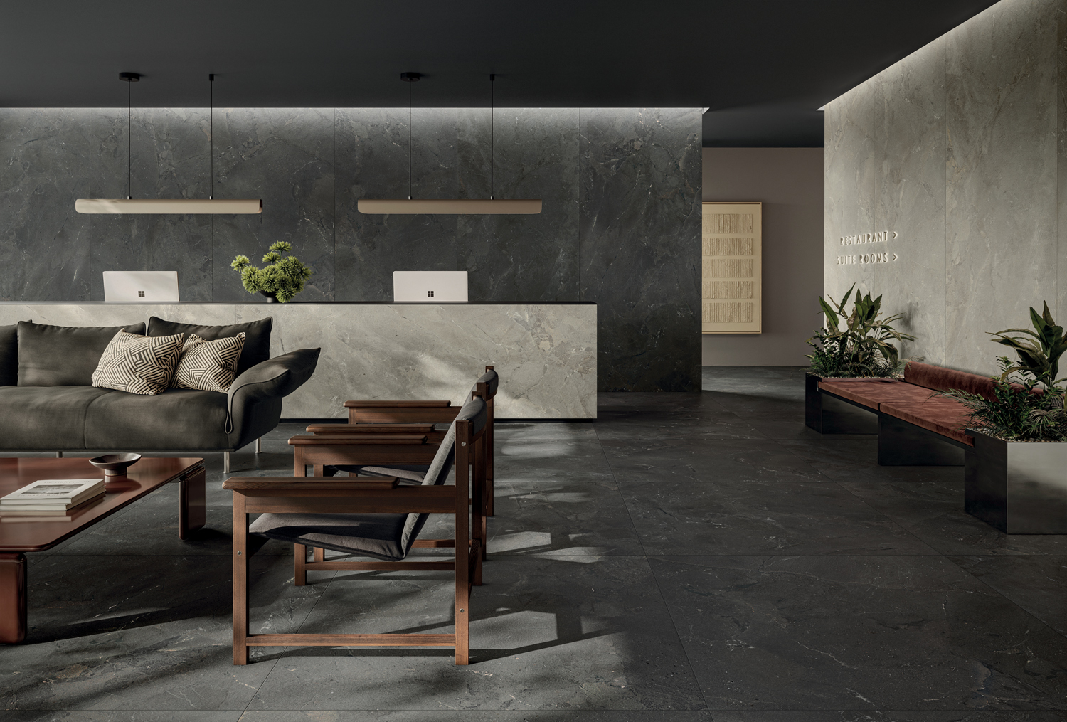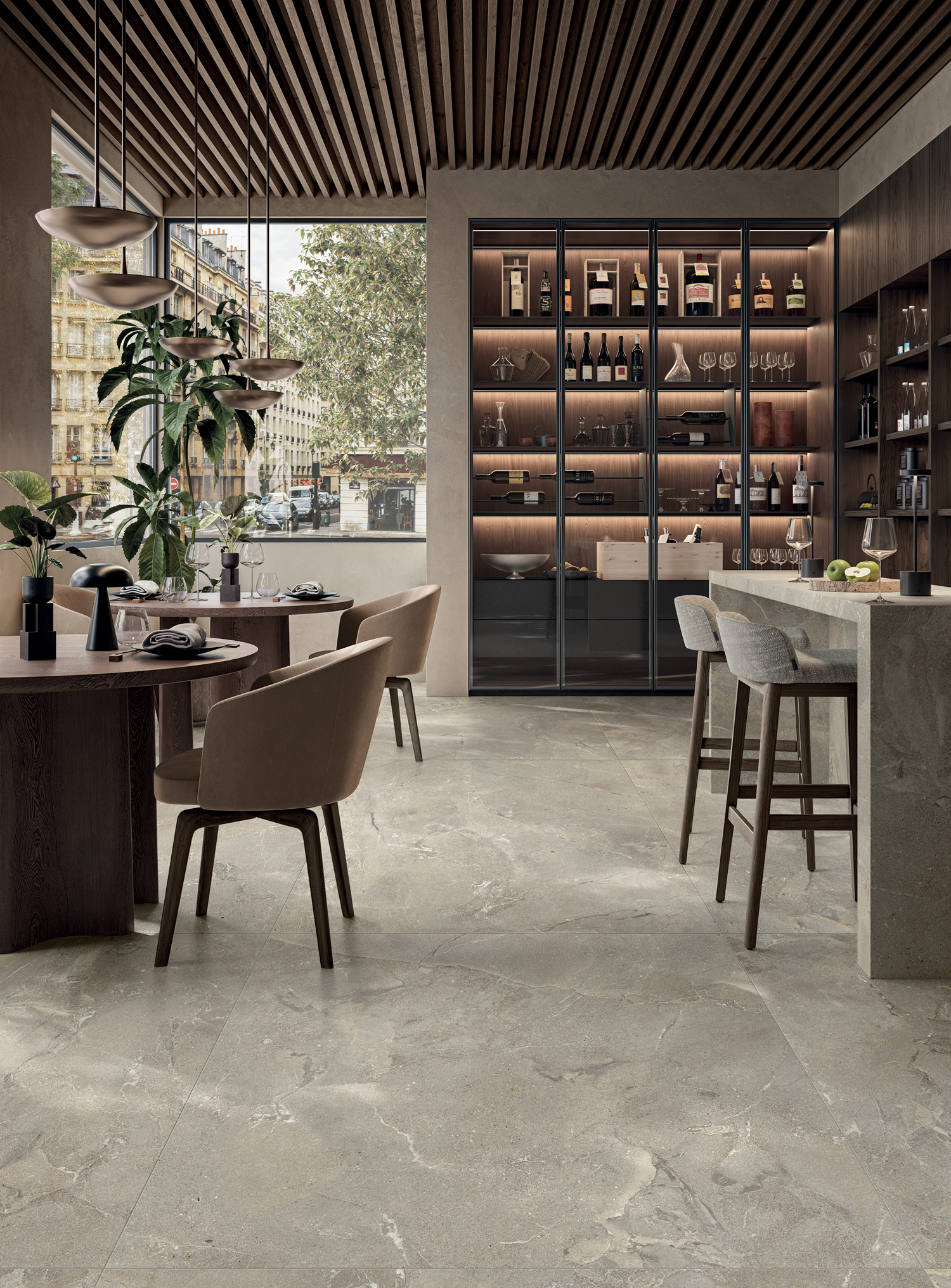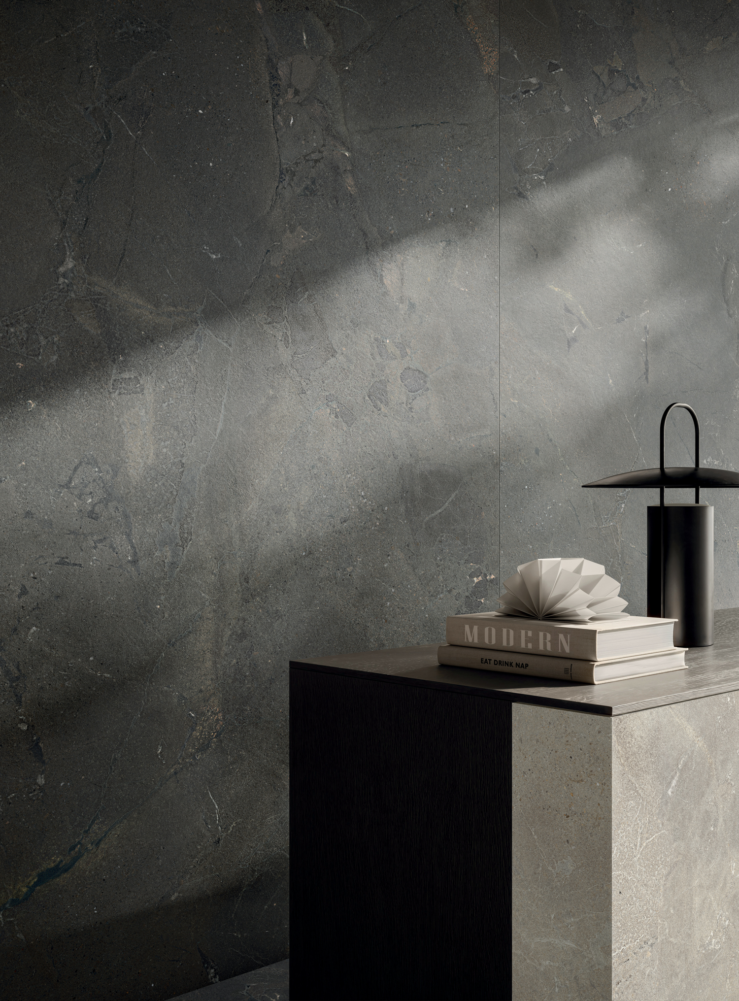 Die Großformate — 120x278 cm Platten und 120x120 cm Feinsteinzeug — verstärken die Fülle der grafischen Bewegung und der materiellen Details und betonen die Einzigartigkeit des Motivs durch eine nahtlose visuelle Kontinuität.