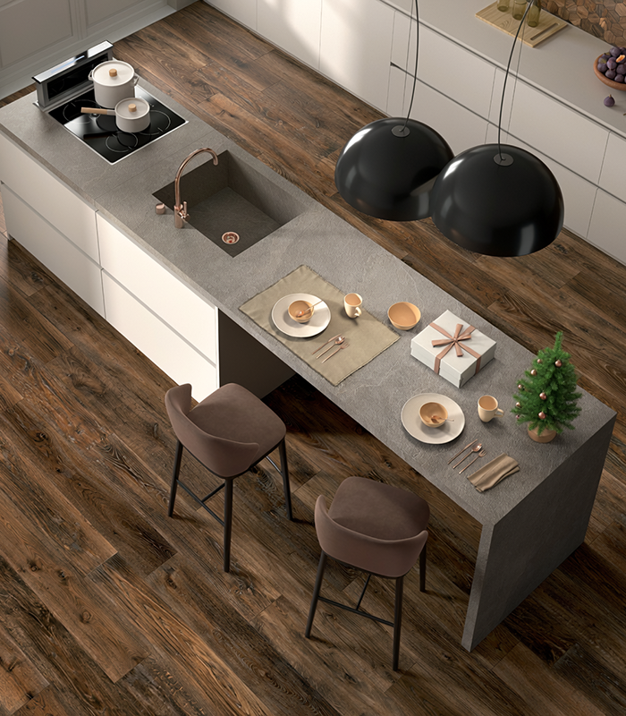 Kairos feiert das Holz in seinem wärmsten und intimsten Ausdruck und schenkt jenes Gefühl von Geborgenheit, das typisch für die Wintersaison ist. Die Oberflächen erfassen die ästhetische Reife der Eiche: weiche Fasern, leichte Patinas und Mikroincisionen erzählen die Zeit und verwandeln das Material in Emotion.