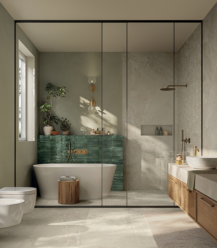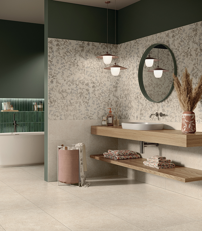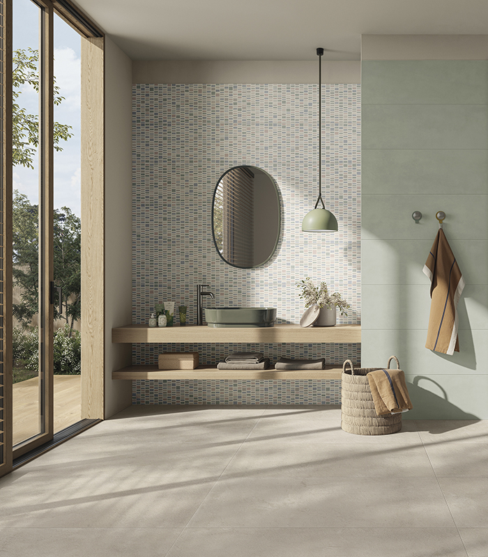 Die Oberflächenästhetik hat sich dagegen zu einer zweifachen Farbwahl verschoben: Einerseits die Bevorzugung von neutralen Tönen, die sehr geschätzt werden, weil sie die Entspannung und die Privatsphäre des Badezimmers positiv beeinflussen, und andererseits dekorative Lösungen, die dem Raum Charakter und Persönlichkeit verleihen. Allround-Wandverkleidungen im Zeichen der Funktionalität und ästhetischen Raffinesse repräsentieren den neuesten Trend für Badverkleidungen, der sich in verschiedenen Stilen, Farben und Oberflächen wiederfindet, um allen Designanforderungen gerecht zu werden.