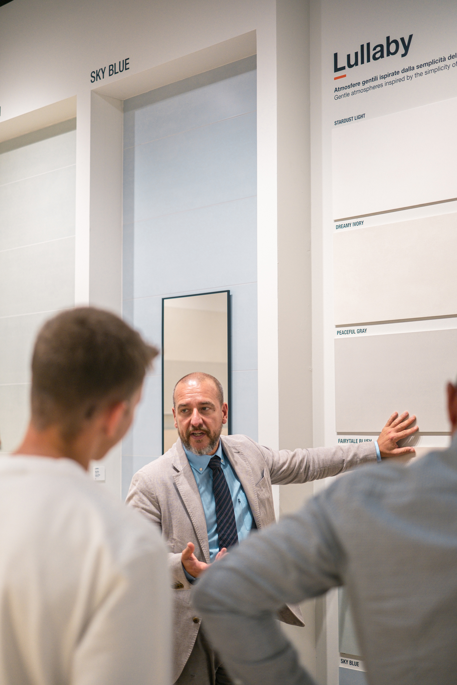 Neben Revel wurde Lullaby präsentiert – zarte Texturen in Pastelltönen, die Leichtigkeit und Luftigkeit in die intimsten Räume bringen und eine helle, einladende Ästhetik schaffen. Mit Lullaby entwirft Panaria Ceramica eine neue Vorstellung von Verkleidung: Oberflächen, die eine sanfte, strahlende Schönheit ins Innere tragen – eine Leichtigkeit, die umhüllt, ohne je aufzudrängen. Mit Lullaby wird Keramik zu einem Instrument, um luftige und helle Räume zu schaffen, die Leichtigkeit und Feinheit zurückgeben an alle, die sie täglich bewohnen. Eine Kollektion, die Farbe in ihrer reinsten und natürlichsten Form zum Ausdruck bringt: schlicht, ruhig, strahlend.