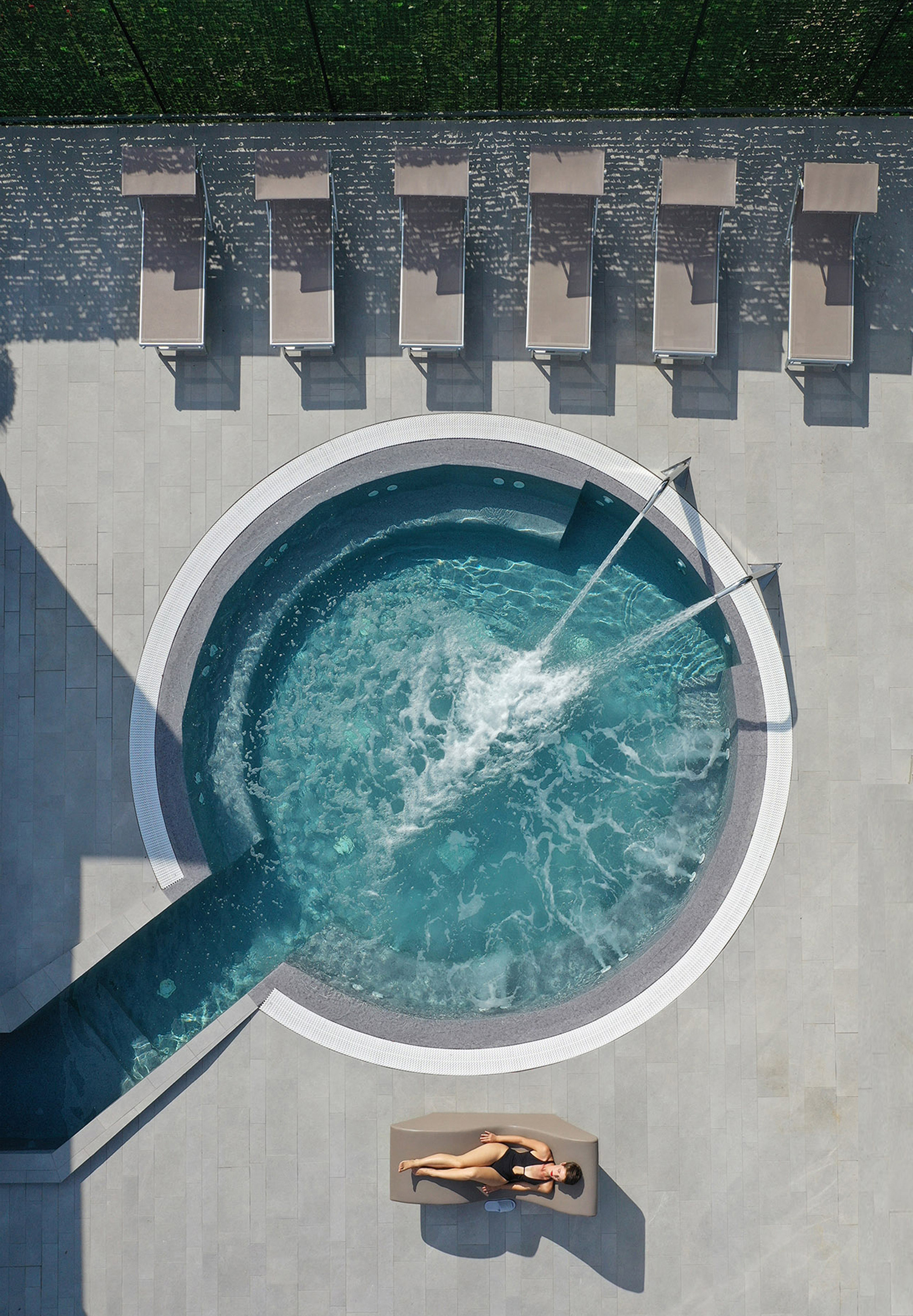 Beachtlich ist der Beitrag von Panaria Ceramica im Wellnessbereich und im SPA, wo die Kollektion Prime Stone unbestritten im Mittelpunkt steht: im Außenbereich kamen Fliesen im Farbton Greige Prime zum Einsatz, im Innenbereich der Farbton Silver Prime. Es handelt sich um eine Bodenlinie mit Steineffekt, die auf überraschende Weise mit dem zeitgenössischen Charakter der Betonoberfl Die für das SPA und die Böden am Poolrand ausgewählten Oberflächen wurden eigens entwickelt, um den richtigen Grad an Grip zu verleihen und Witterungseinflüssen, der Aufnahme von Wasser, Chlor und chemischen Substanzen – draußen – oder Feuchtigkeit und Hitze, sowie Reinigungs- und Desinfektionsmitteln – bei den Innenräumen des Wellnessbereichs – zu widerstehen. Ein Hauch von intensiver Entspannung, Mysterium und Faszination entsteht hingegen durch den dunklen Farbton Marquina Black der Kollektion Eternity mit großen Keramikplatten, die das SPA-Ambiente zu einem wahren Refugium macht - ein Ort, wo man die Seele baumeln lassen kann. Diese Kollektion bringt eine Auswahl der kostbarsten in der Natur vorkommenden Marmore zum Ausdruck, die sich in haltbare und vielseitige dünne Oberflächen aus laminiertem Feinsteinzeug verwandeln.